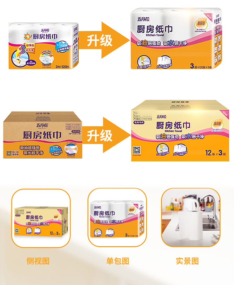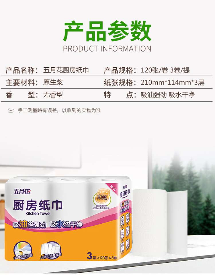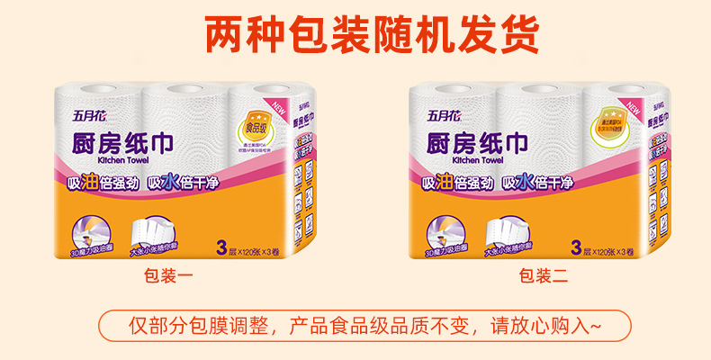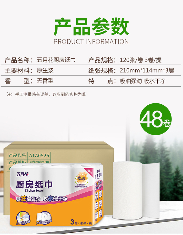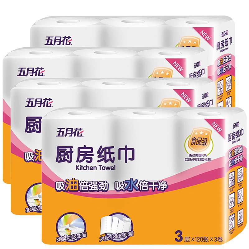 五月花厨房纸巾卷纸吸油纸3层120张48卷整箱